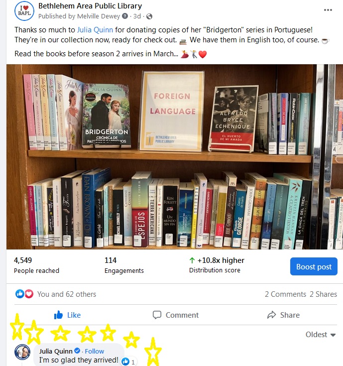 Our awesome Technical Services Librarian Sue quickly put them in the catalog and I took a photo of the books in our Foreign Language section at the Main Library to promote it online. Soon a Facebook comment arrived from no other than Julia Quinn herself! Swoon! What a gracious person in addition to being an awesome author.