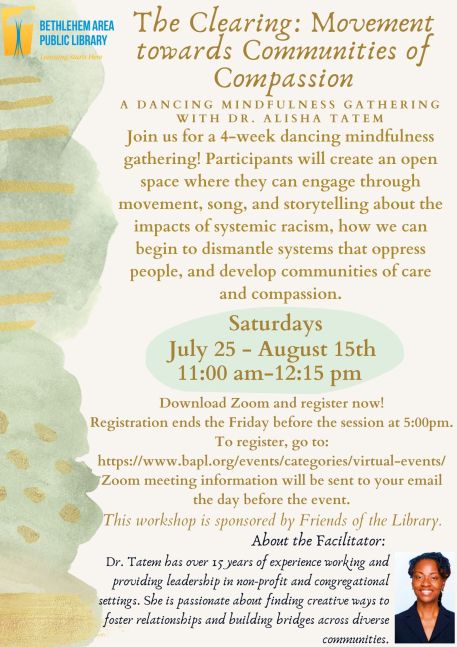 - A Dancing Mindfulness Gathering with Dr. Alisha Tatem. Thank you, Dr. Tatem, for leading this program!
