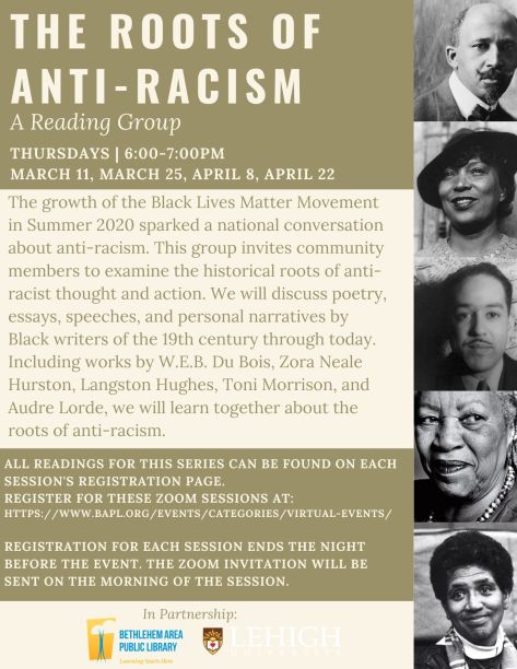 - A 4-session reading group offered in partnership with Lehigh University. This group invites community members to examine the historical roots of anti-racist thought and action. We will discuss poetry, essays, speeches, and personal narratives by Black writers of the 19th century through today. Including works by W.E.B. Du Bois, Zora Neale Hurston, Langston Hughes, Toni Morrison, and Audre Lorde, we will learn together about the roots of anti-racism.