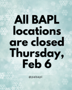 February 5, 2025 All BAPL locations closed Feb 6 Share EmailTwitterFacebookGoogle +PinterestTumblrLinkedinVkontakte All BAPL locations are closed Thursday, February 6 due to the severe winter weather in the forecast. February 6, 2025 Schedule Alerts