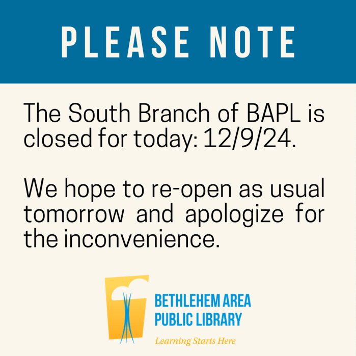 The South Side Branch of BAPL is closed for today, December 9, 2024. We hope to be back to our normal schedule tomorrow and we apologize for the inconvenience.