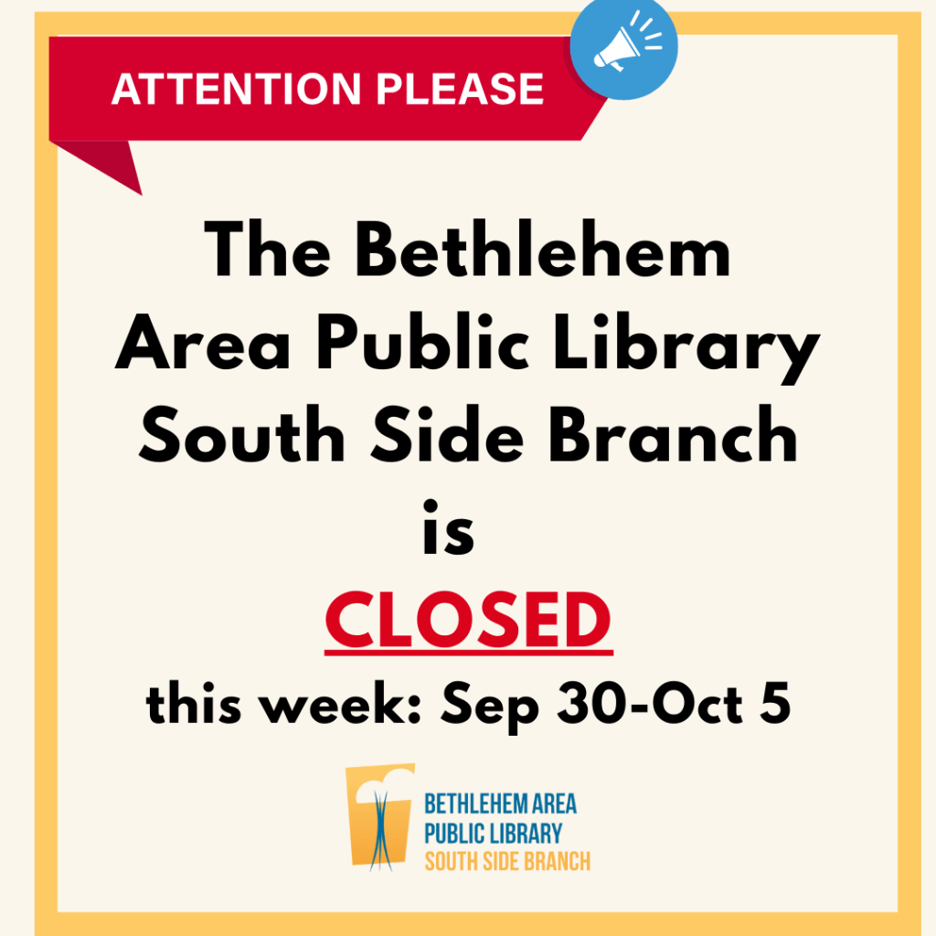 September 30, 2024 The Bethlehem Area Public Library South Side Branch is CLOSED this week: Sep 30-Oct 5 Share EmailTwitterFacebookGoogle +PinterestTumblrLinkedinVkontakte The Bethlehem Area Public Library South Side Branch is CLOSED this week: Sep 30-Oct 5 September 30, 2024 Schedule Alerts