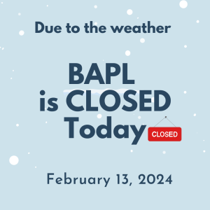 Due to the inclement weather, all BAPL locations will be closed today, February 13, 2024.