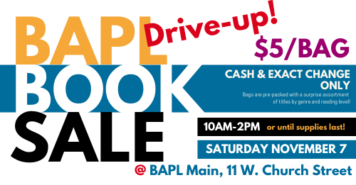 The date for the next one is November 7 at the Main Library. It will feature lots of holiday books for sale! The sale is scheduled to run 10-2 or until supplies last. The way it works is that you simply drive up to the Main Library at 11 W. Church St. and buy a bag of books for $5. We’ll have bags for kids and adults as well as popular themes, but the exact contents of each bag will be a little bit of a mystery.