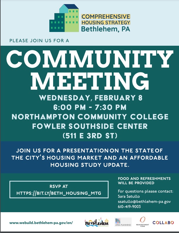 The City of Bethlehem’s Affordable Housing Strategy is at its midpoint. The City is excited to share initial findings and a summary of important data that has been collected and analyzed. Join for a Community Meeting to learn about the current state of Bethlehem’s housing market including the results of a survey of more than 3,500 local residents.