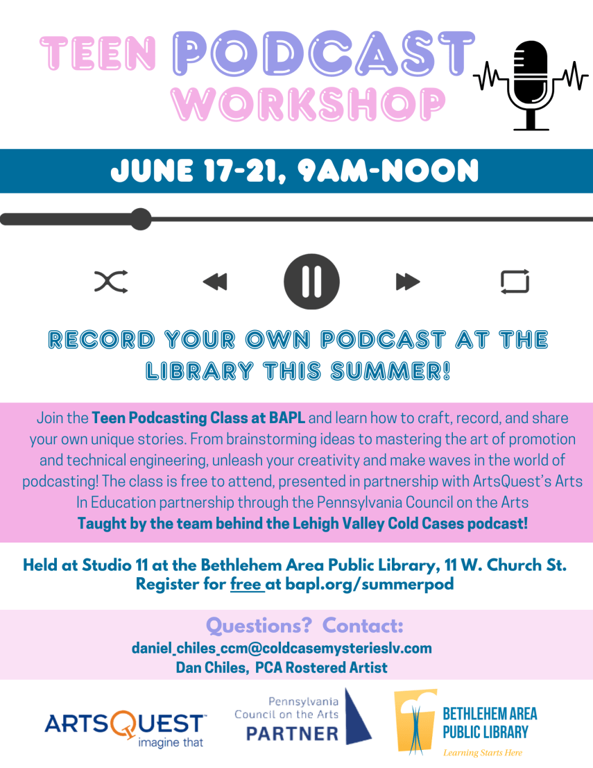 Join the Teen Podcasting Class at BAPL and learn how to craft, record, and share your own unique stories. From brainstorming ideas to mastering the art of promotion and technical engineering, unleash your creativity and make waves in the world of podcasting! The class is free to attend, presented in partnership with ArtsQuest’s Arts In Education partnership through the Pennsylvania Council on the Arts Taught by the team behind the Lehigh Valley Cold Cases podcast! The class runs June 17 through June 21, 9-12 each day. Registration is required.