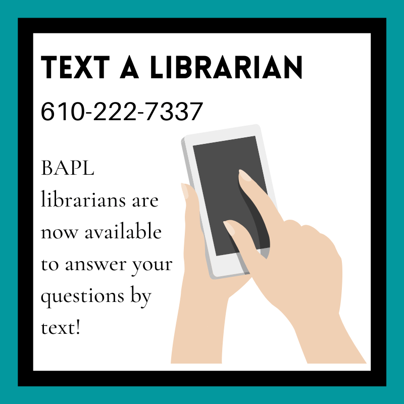 BAPL is happy to announce a new “text a librarian” service. All you need to do is send a text to us at 610-222-7337 and we’ll get back to you with a response. It’s like having a little librarian who lives in your phone! Try it out!